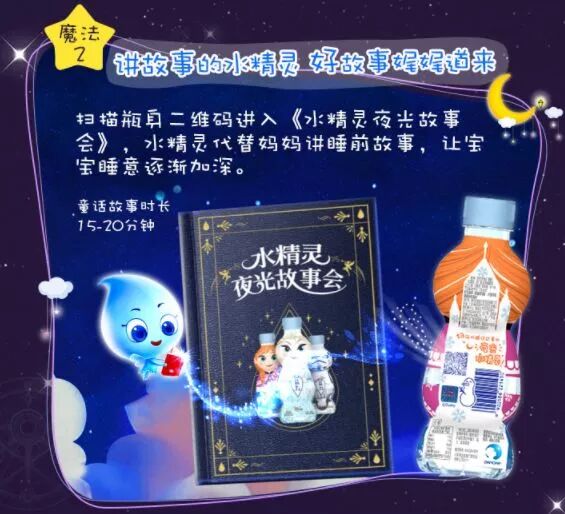 扫描瓶身二维码,即可进入《水精灵夜光故事会》,语音呈现15-20分钟的童话故事,陪伴儿童入睡。目前该产品已在京东超市上市!这样的包装黑科技你心动了吗?