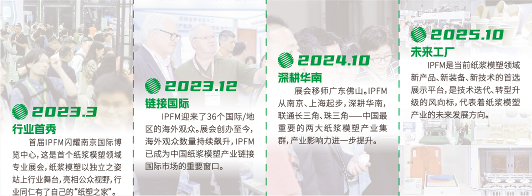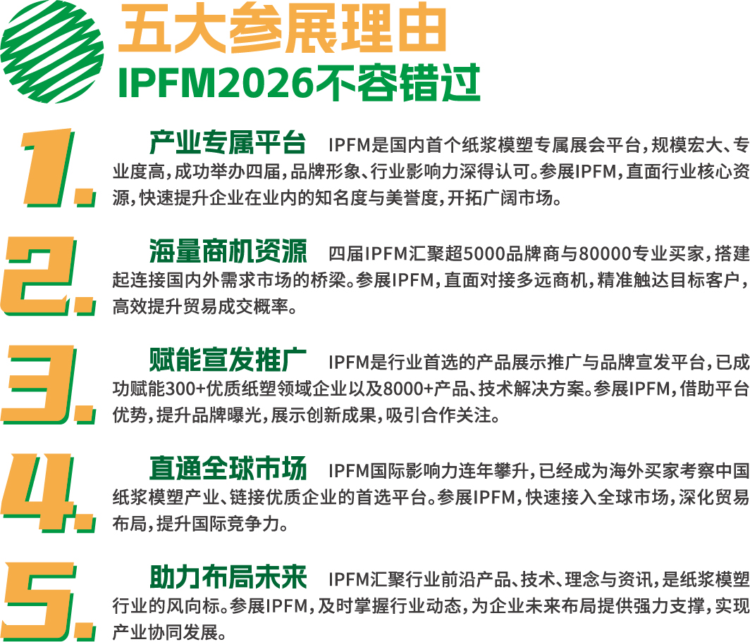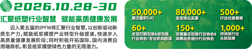 2026年10月28-30日,IPFM2026将在中国·广东·佛山潭洲国际会展中心隆重举行!迈入第五届的IPFM将汇聚行业智慧,以创新驱动新质生产力,赋能纸浆模塑产业转型升级提速,快速步入高质量健康发展阶段;同时积极开拓国际、国内消费应用端商机,彰显纸浆模塑绿色力量的无限潜力。
